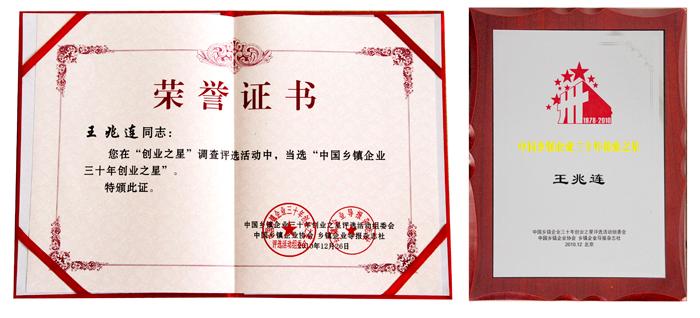 為表彰對鄉鎮企業發展做出突出貢獻的企業領軍人物,樹立行業典范,促進鄉鎮企業持續健康快速發展,經鄉鎮企業導報雜志社提名,人民日報人民網、中國鄉鎮企業協會的大力支持,聯合首都多家新聞媒體,經網絡民意初選,綜合評選組委會權威專家意見,通過程序報請批準,公司董事長兼總經理王兆連被評為“中國鄉鎮企業三十年創業之星”。
