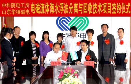 山東半島藍(lán)色經(jīng)濟(jì)區(qū)建設(shè)已正式上升為國家戰(zhàn)略,成為國家海洋發(fā)展戰(zhàn)略和區(qū)域協(xié)調(diào)發(fā)展戰(zhàn)略的重要組成部分。為保護(hù)海洋生態(tài),解決海水油污染治理難題,為山東“藍(lán)區(qū)”建設(shè)提供技術(shù)支撐,2011年9月28日,公司與中科院電工所“電磁流體海水浮油分離與回收技術(shù)”技術(shù)開發(fā)合同簽字儀式在公司總部舉行。公司董事長兼總經(jīng)理王兆連與電工所成果轉(zhuǎn)化處處長丁明仁分別代表雙方在合同上簽字。