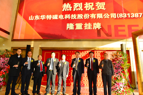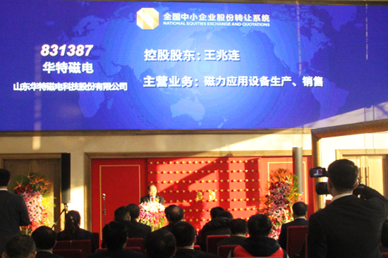 12月8日上午,山東華特磁電科技股份有限公司“新三板”掛牌儀式在全國中小企業(yè)股份轉(zhuǎn)讓有限責(zé)任公司隆重舉行。濰坊市金融工作辦公室副主任張新華、臨朐縣委常委、常務(wù)副縣長衣利民、臨朐縣金融工作辦公室主任高凌利、臨朐縣城關(guān)街道黨工委書記沈明新、臨朐縣東城街道黨工委書記孫傳坤、山東華特磁電科技股份有限公司董事長王兆連及公司股東和高管、臨朐縣相關(guān)企業(yè)負(fù)責(zé)人出席本次掛牌儀式。