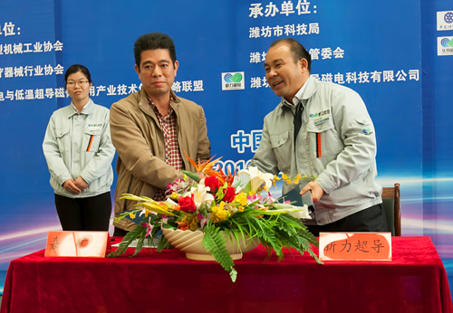 在論壇舉行期間,廣東嘉源礦業(yè)有限公司為了迅速擴(kuò)產(chǎn)提能,提高企業(yè)競(jìng)爭(zhēng)力,與濰坊新力超導(dǎo)公司進(jìn)一步深入合作,林東耀副總經(jīng)理與新力超導(dǎo)公司常務(wù)副總經(jīng)理李培勇先生代表兩公司簽訂了3臺(tái)5T/500低溫超導(dǎo)磁選機(jī)和1臺(tái)5.5T/300低溫超導(dǎo)磁選機(jī)訂購(gòu)合同,合同總金額3250萬(wàn)元。