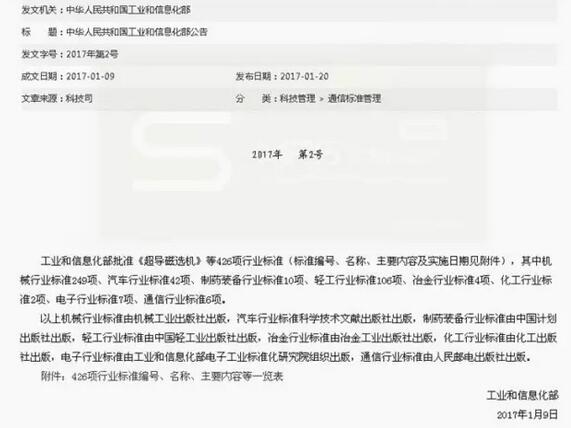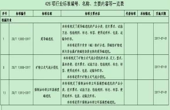 2017年7月1日,由華特磁電主持制定的《JB/T 13013-2017強制油冷卻立環(huán)高梯度磁選機》、《JB/T 13008-2017礦物氣流分級機》、參與制定的《JB/T 13002-2017超導磁選機》等3項行業(yè)標準由國家工業(yè)和信息化部正式頒布實施。截至目前,華特磁電已累計主持制定和參與制定行業(yè)標準達16項。