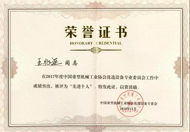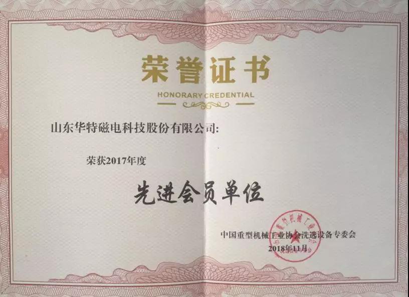 中國重型機械工業協會洗選設備專業委員會副理事長、鎮江電磁設備廠有限責任公司董事長楊鋼宣讀了2017年度優秀單位及優秀協會工作者的表彰決定,山東華特磁電科技股份有限公司被評為“2017年度先進會員單位”,董事長王兆連被評為“先進個人”。