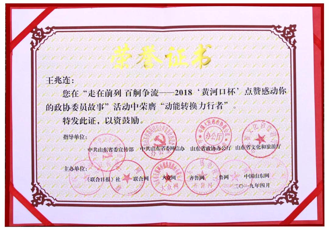 王兆連董事長在“走在前列 百舸爭流——2018‘黃河口杯’點贊感動你的政協委員故事”活動中榮膺“動能轉換力行者”